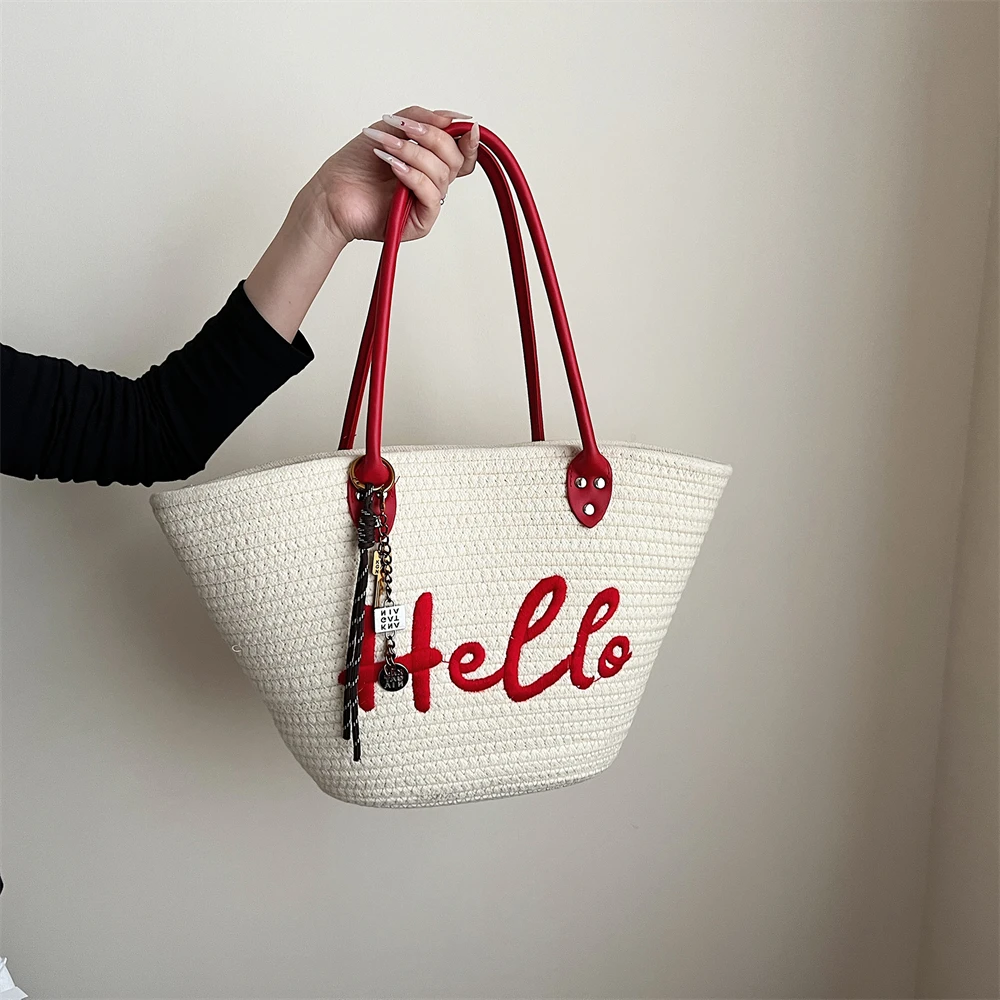 Simple Fashion Big Tote Bags For Women Cotton Fabric Woven Design Letter Embroidered Luxury Large Capacity Shopper Shoulder Bag